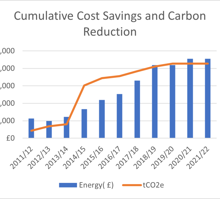 A recycling fund was set up to invest into energy/carbon reductions. The annual savings were reinvested into new projects each year for a ten year period. The compound annual growth rate was 30.16%, the total carbon emissions saved was over 7,500tCO2e and the reduction in final year for energy costs was circa £2M.